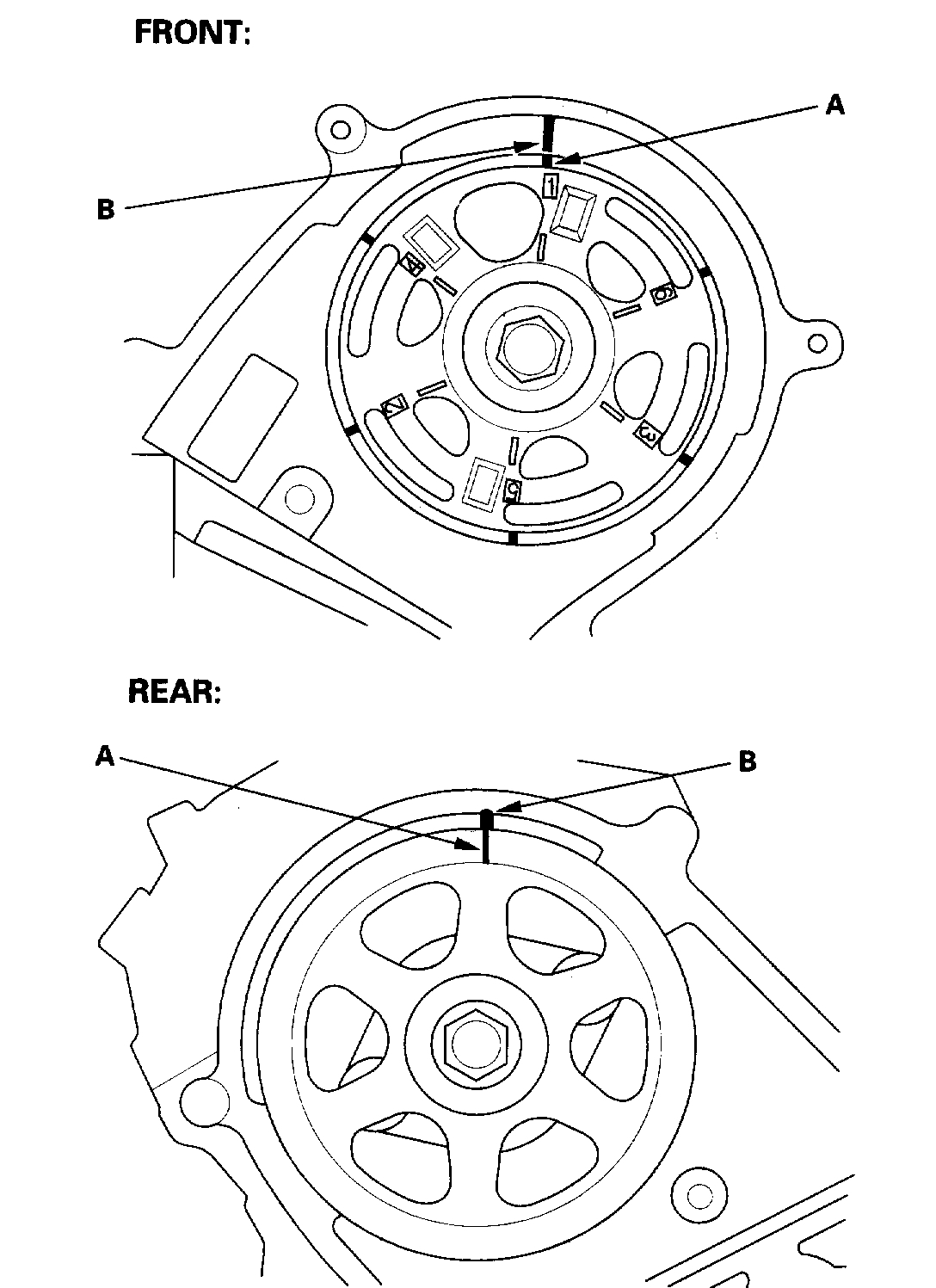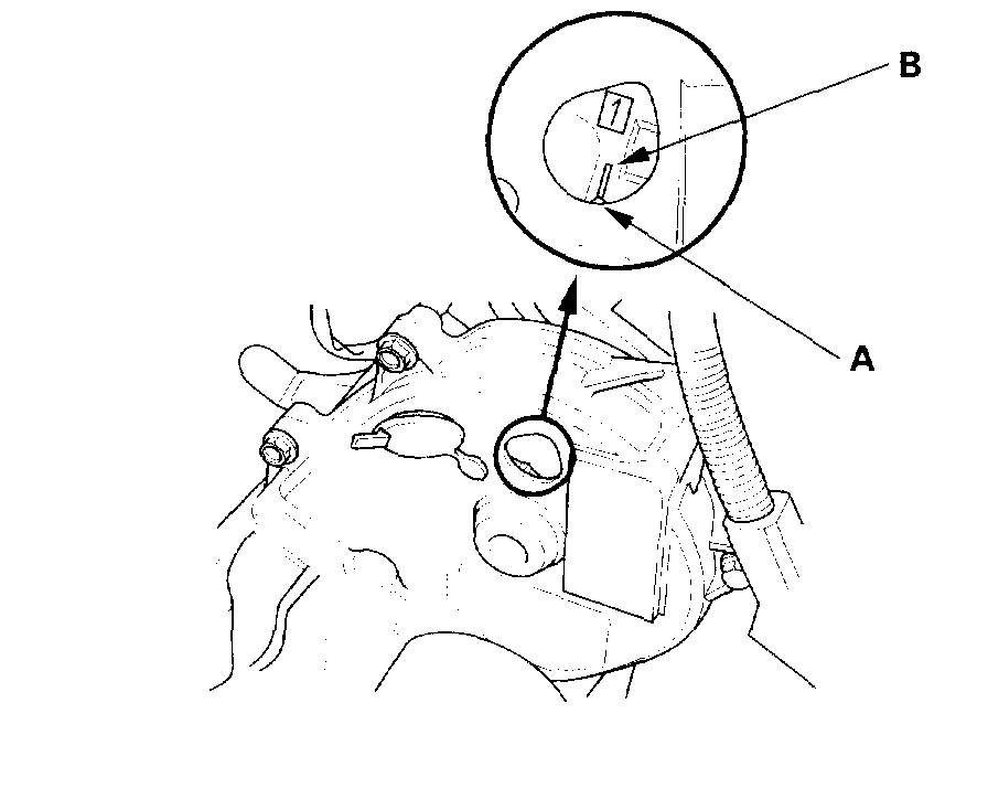 5. Turn the crankshaft so its white mark (A) lines up with the pointer (B).