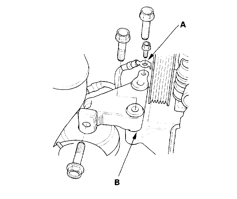 8. Remove the ground cable (A), then remove the side engine mount bracket (B).