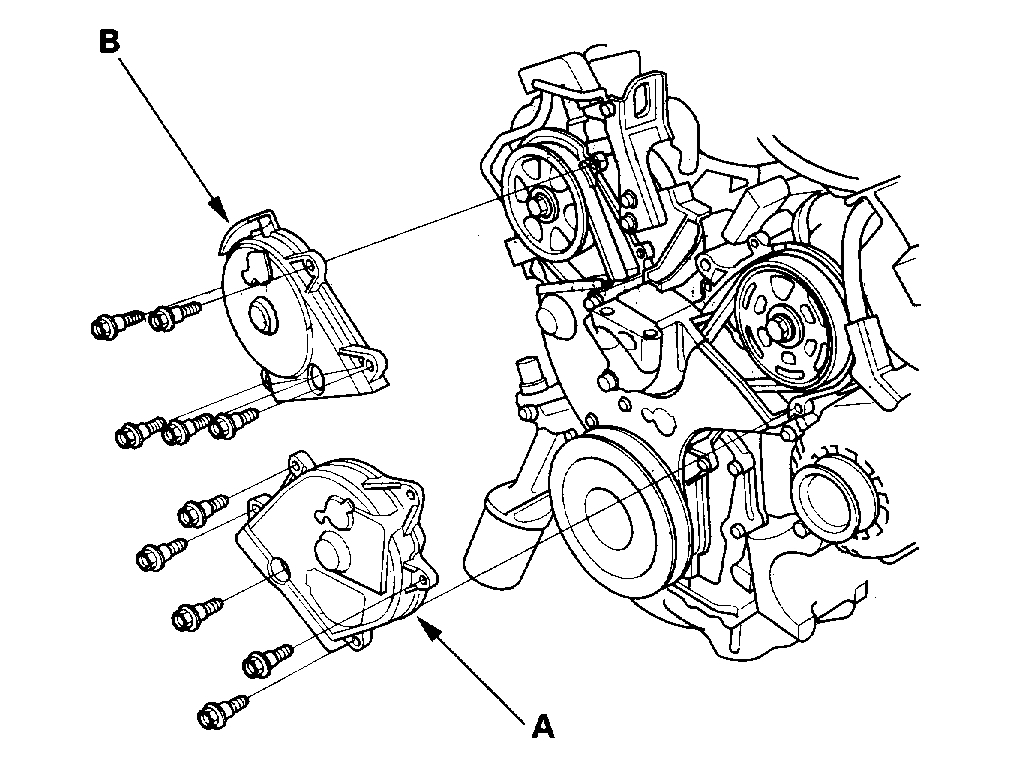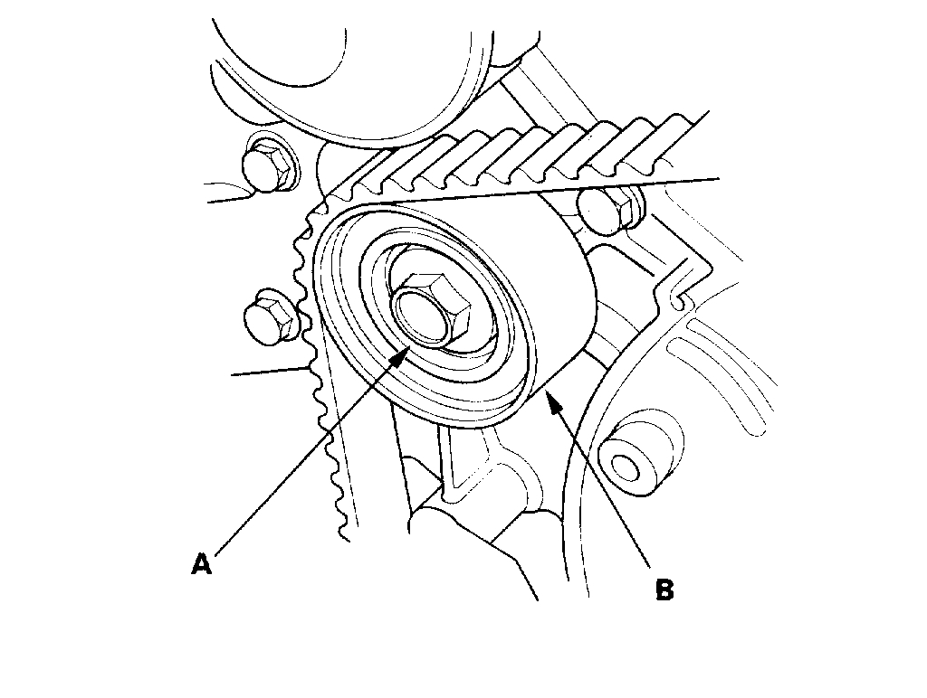 16. Remove the idler pulley bolt (A) and idler pulley (B), then remove the timing belt.