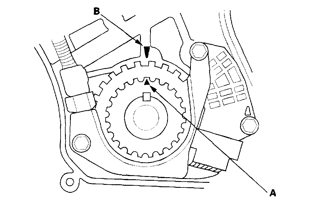 3. Set the timing belt drive pulley to TDC by aligning the TDC mark (A) on the tooth of the timing belt drive pulley with the pointer (B) on the oil pump.