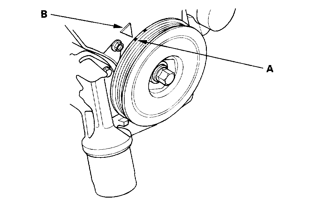 22. Turn the crankshaft pulley so its white mark (A) lines up with the pointer (B).