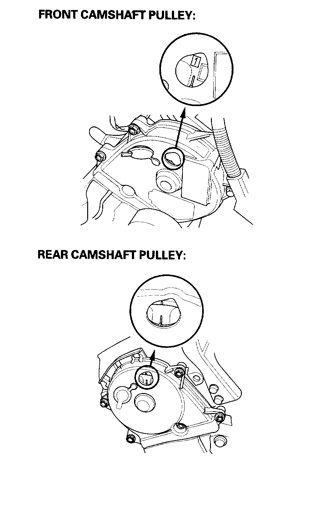 Note: If the marks are not aligned, rotate the crankshaft 360 degrees, and recheck the camshaft pulley mark.