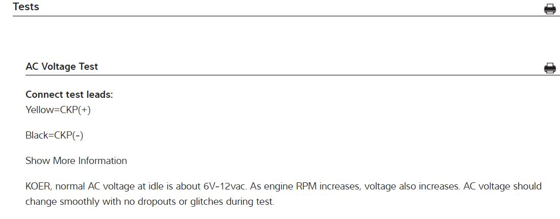 I have included the information that you requested in the diagrams down below. There are a couple of other tests that I did not include because they require the use of a dual lab scope. I have also included a link below for you to go to below.