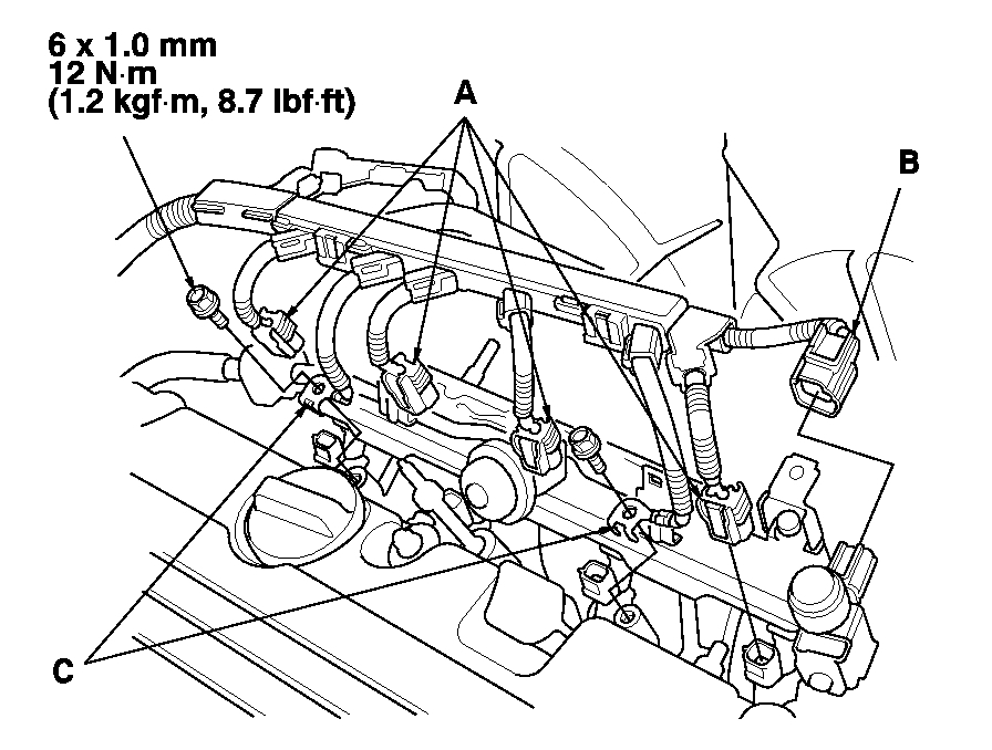 9. Disconnect the four fuel injector connectors (A), the engine mount control solenoid valve connector (B), and remove the ground cables (C).