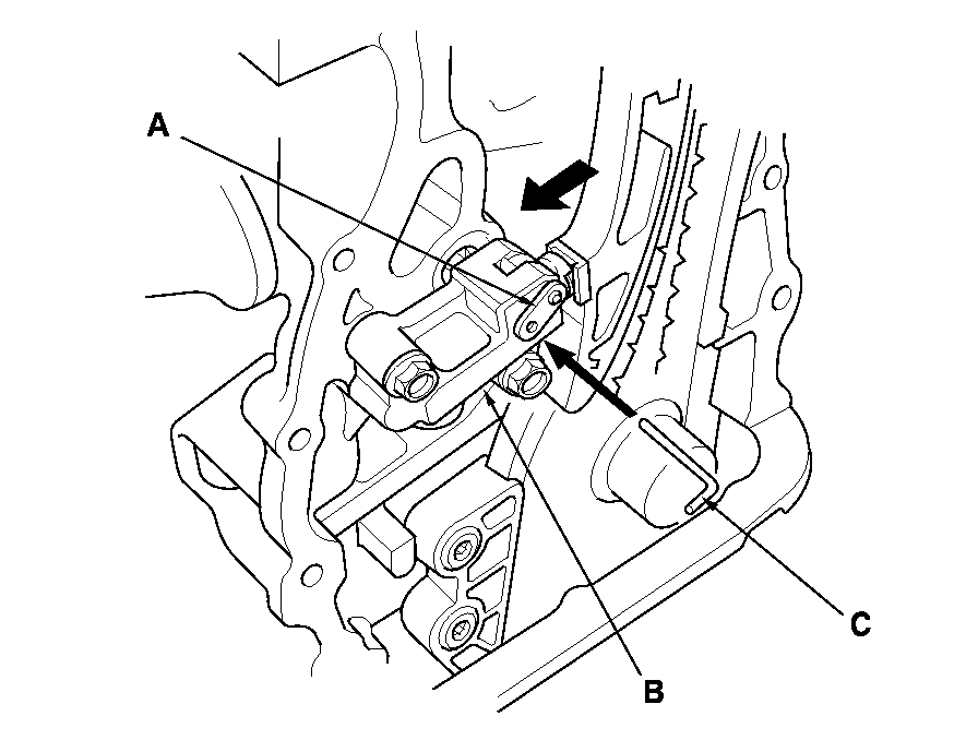 3. To hold the intake camshaft, insert a camshaft lock pin (P/N 07AAB-RWCA120) (A) into the maintenance hole in camshaft position (CMP) pulse plate A (B) and through the No. 5 rocker shaft holder (C).