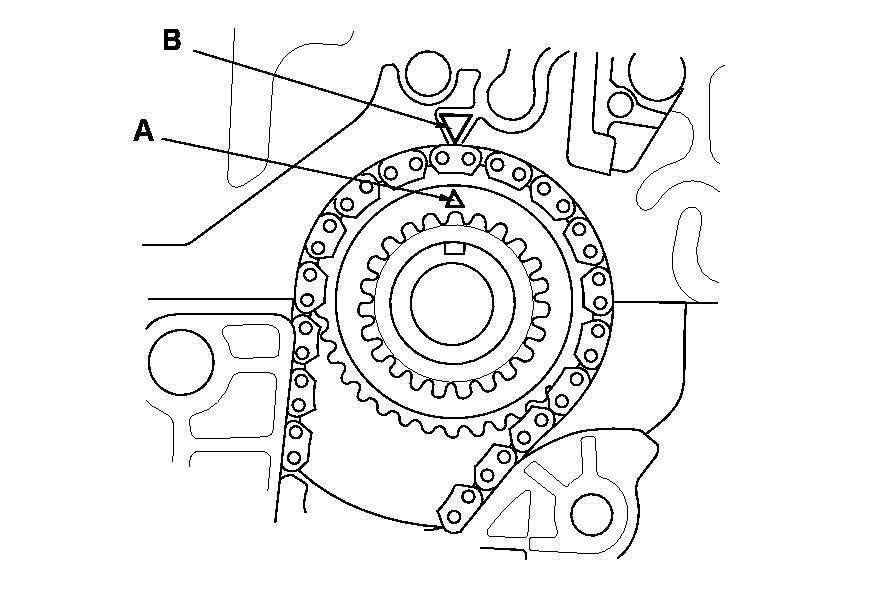 1. Set the crankshaft to top dead center (TDC). Align the TDC mark (A) on the crankshaft sprocket with the pointer (B) on the engine block.