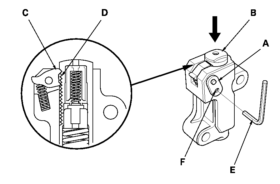 8. Compress the auto-tensioner when replacing the cam chain. Remove the pin from the auto-tensioner. Turn the plate (A) counterclockwise, to release the lock, then press the rod (B), and set the first cam (C) to the first edge of the rack (D). Insert the 1.2 mm (0.05 in.) diameter pin or lock pin (P/N 14511-PNA-003) (E) into the holes (F).