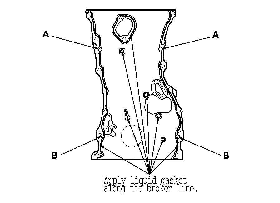 17. Apply liquid gasket to the engine block upper surface contact areas (A) on the chain case and lower block upper surface contact areas (B) on the chain case.