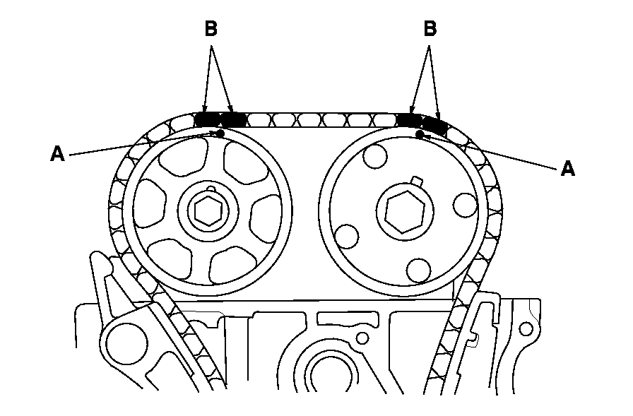 6. Install the cam chain on the VTC actuator and the exhaust camshaft sprocket with the punch marks (A) aligned with the center of the two colored link plates (B).