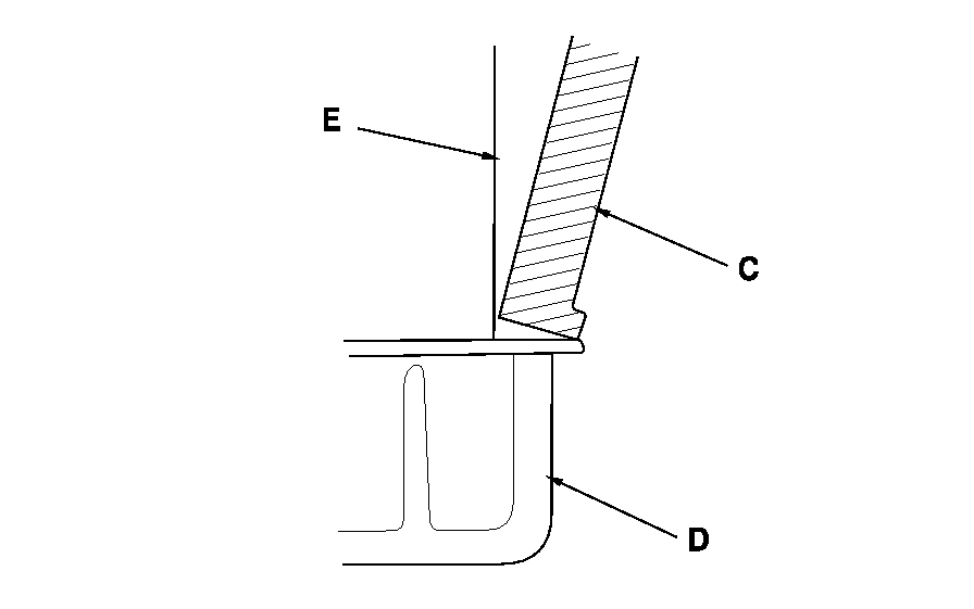 19. Install the spacer (A), then install the new O-ring (B) on the chain case. Set the edge of the chain case (C) to the edge of the oil pan (D), then install the chain case on the engine block (E). Wipe off the excess liquid gasket on the oil pan and chain case mating surface.
