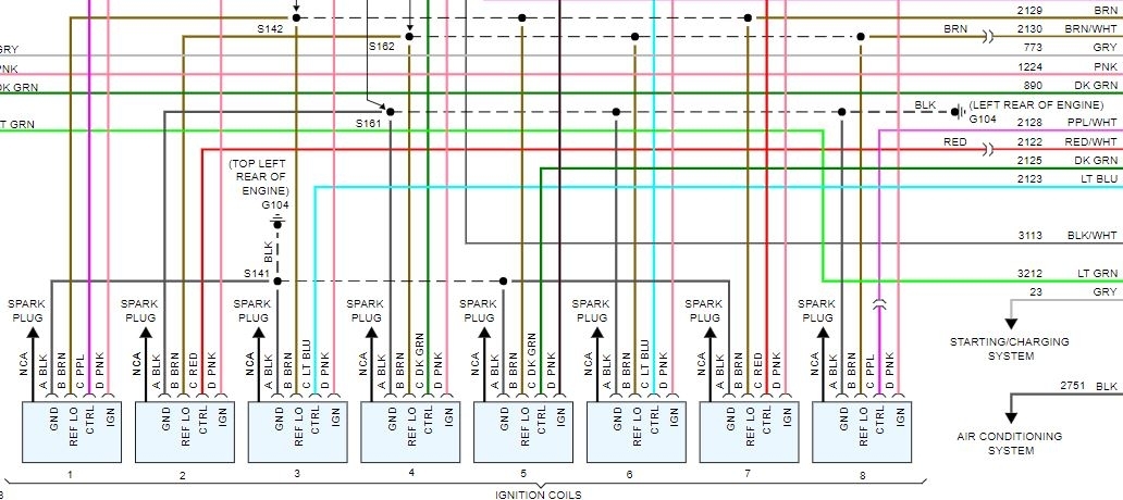 Now, if you find there is no spark, I think I know what is wrong. All of the coil packs have a common ground. The ground wire is black and is part of the wiring harness on the intake for the coil packs. The ground location is on the top left rear of the engine block. See the schematic I attached: