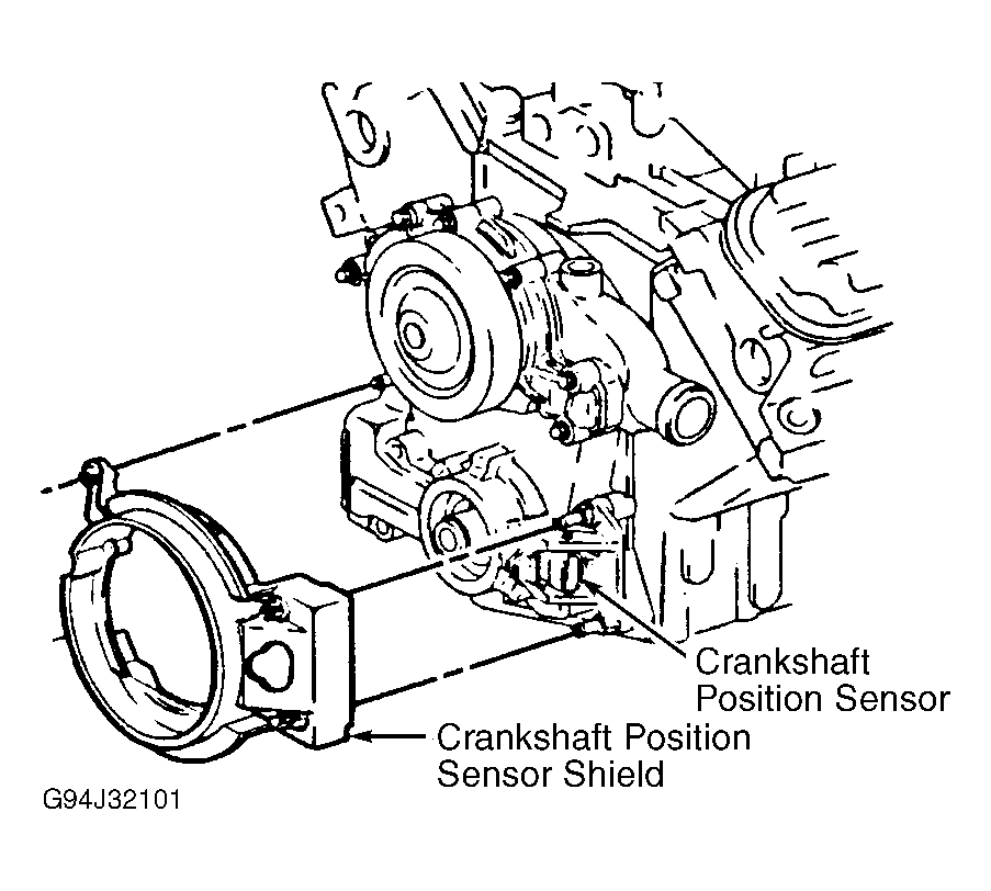 Remove the crankshaft balancer retaining bolt. Install the Crankshaft Balancer Remover (J-38197-A). Remove the crankshaft balancer. Remove the crankshaft balancer remover. Disconnect the Crankshaft Position (CKP) sensor electrical connector. Remove the CKP sensor shield. See Fig 3. DO NOT use a pry bar. Remove the CKP sensor studs. Remove the CKP sensor.