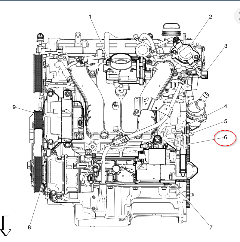 Sorry for the delay. The crank sensor is behind the starter. I attached a different view and circled the number 6 that points to the sensor.