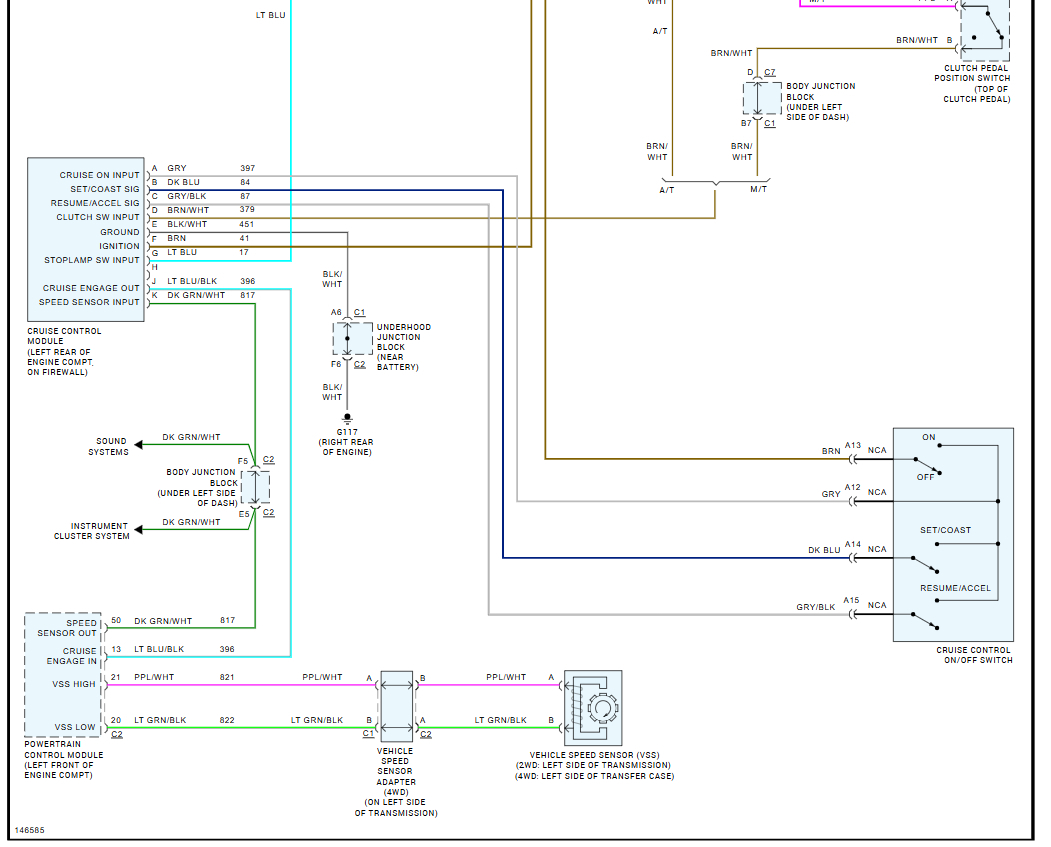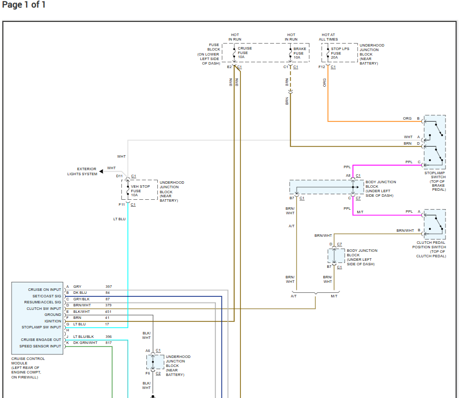 cruise control will not work at all, not even the indicator light. When I pulled the connector on the cruise control module and checked for voltage pin 'g' 'LT Blue' wire does not indicate voltage with or without brake pedal pushed.