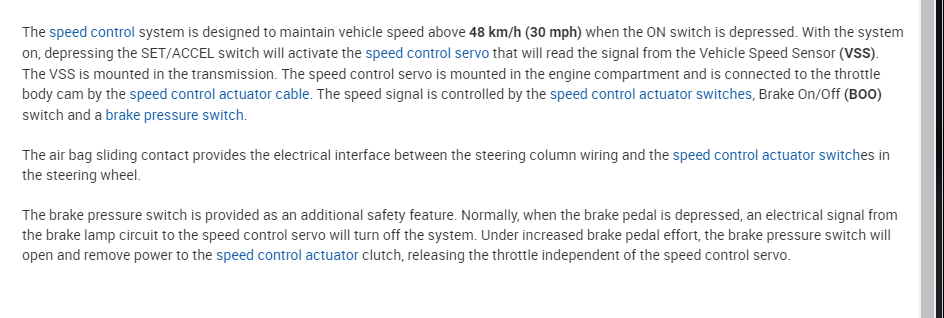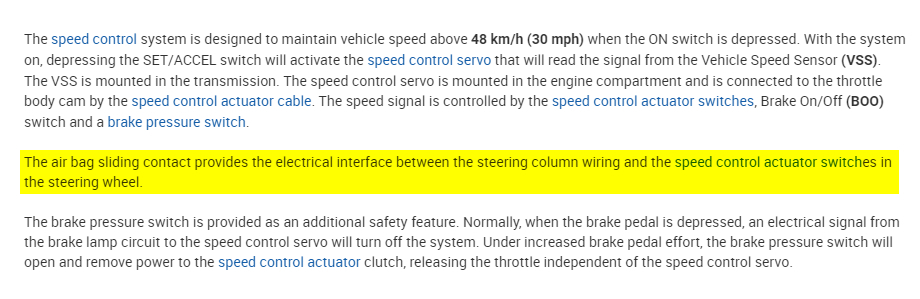 The unfortunate thing is there is no easy way to test these components other than seeing if you have power at the speed control servo. If you do then the switch and clock-spring are working. At that point it is most likely the servo but again, I would expect the light in the cluster to come on. Which means it probably will not have power there.