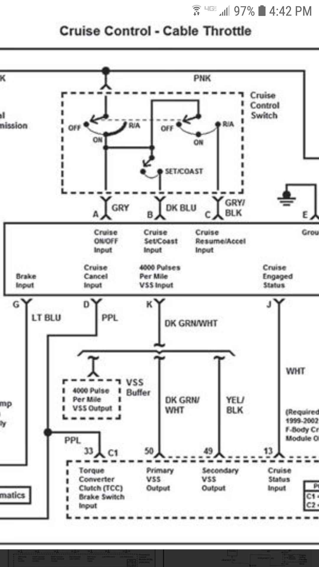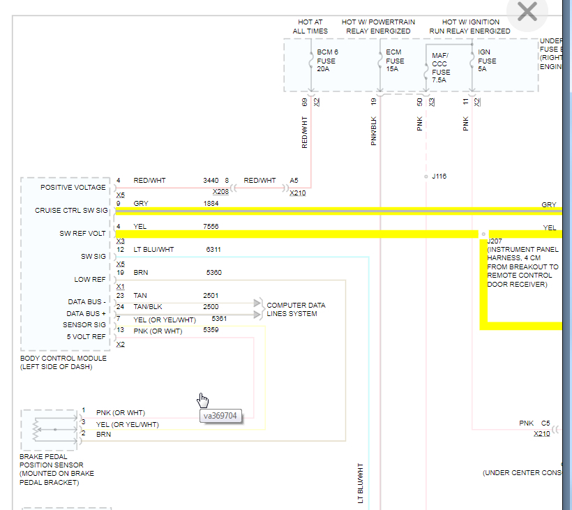 If you look at what the blue arrows I added are pointing too, those are resistors in the switch. This tells us that when the cancel button is pressed it grounds the signal wire and then BCM sees a voltage signal. When one of the other buttons are pressed, it grounds the signal wire but the voltage passes through other resistors and it changes the voltage the BCM sees so it knows that a different button has been pressed.