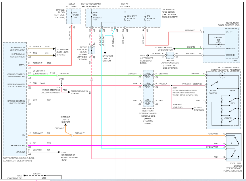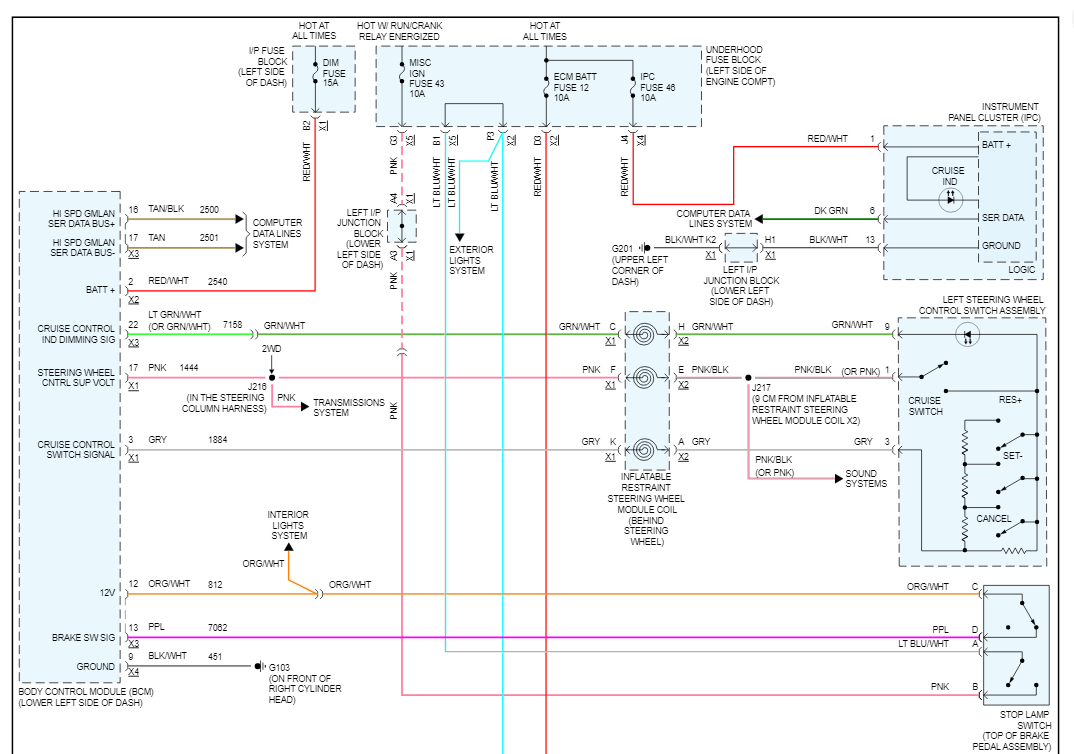 My cruise control doesn’t work. The light on the button lights up but the dash light doesn’t work, nor does it set the cruise. I am trying to find the wiring diagram for the entire cruise control system including interior panel fuses and main panel fuses. Thanks
