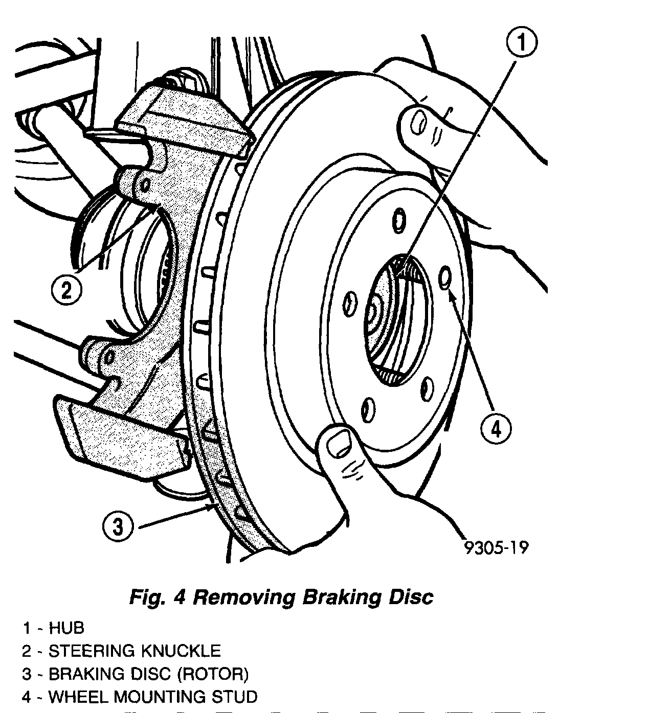 (4)Remove front braking disk (rotor) from hub, by pulling it straight off wheel mounting studs (Fig. 4).