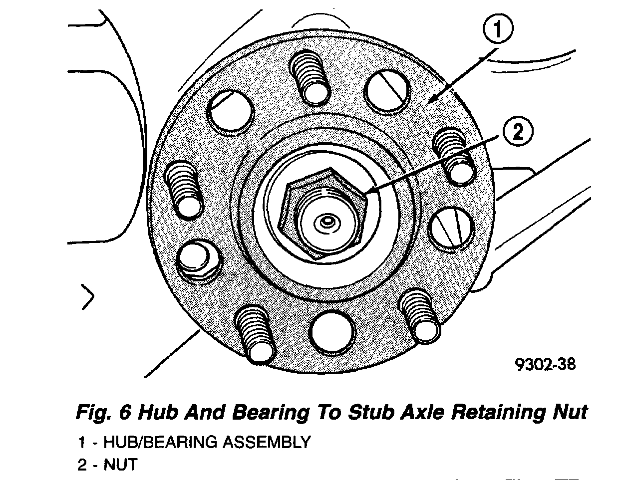 (6)Remove the hub and bearing-to-stub axle retaining nut (Fig. 6).
