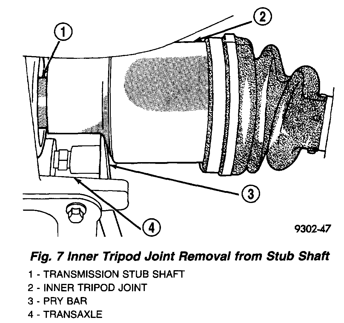 (7)Dislodge inner tripod joint from stub shaft retaining snap ring on transaxle assembly (Fig. 7). Inner tripod joint is dislodged from stub shaft retaining snap ring, by inserting a pry bar between transaxle case and inner tripod joint and prying on tripod joint. Only disengage the inner tripod joint from the retaining snap ring. Do not attempt to remove the inner tripod joint from the transmission stub shaft at this time.