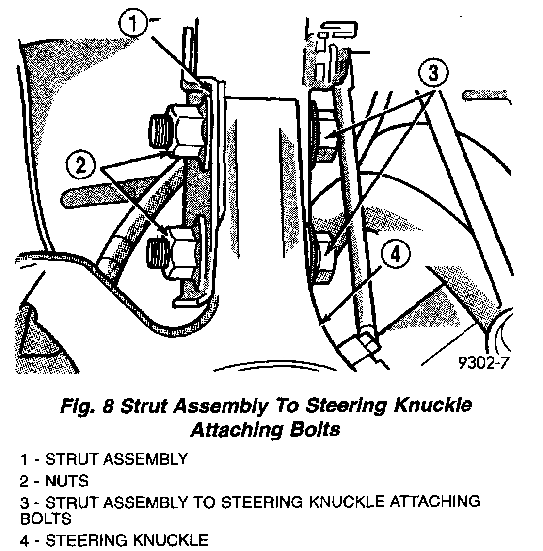 (8)Remove the strut assembly to steering knuckle attaching bolts (Fig. 8).
