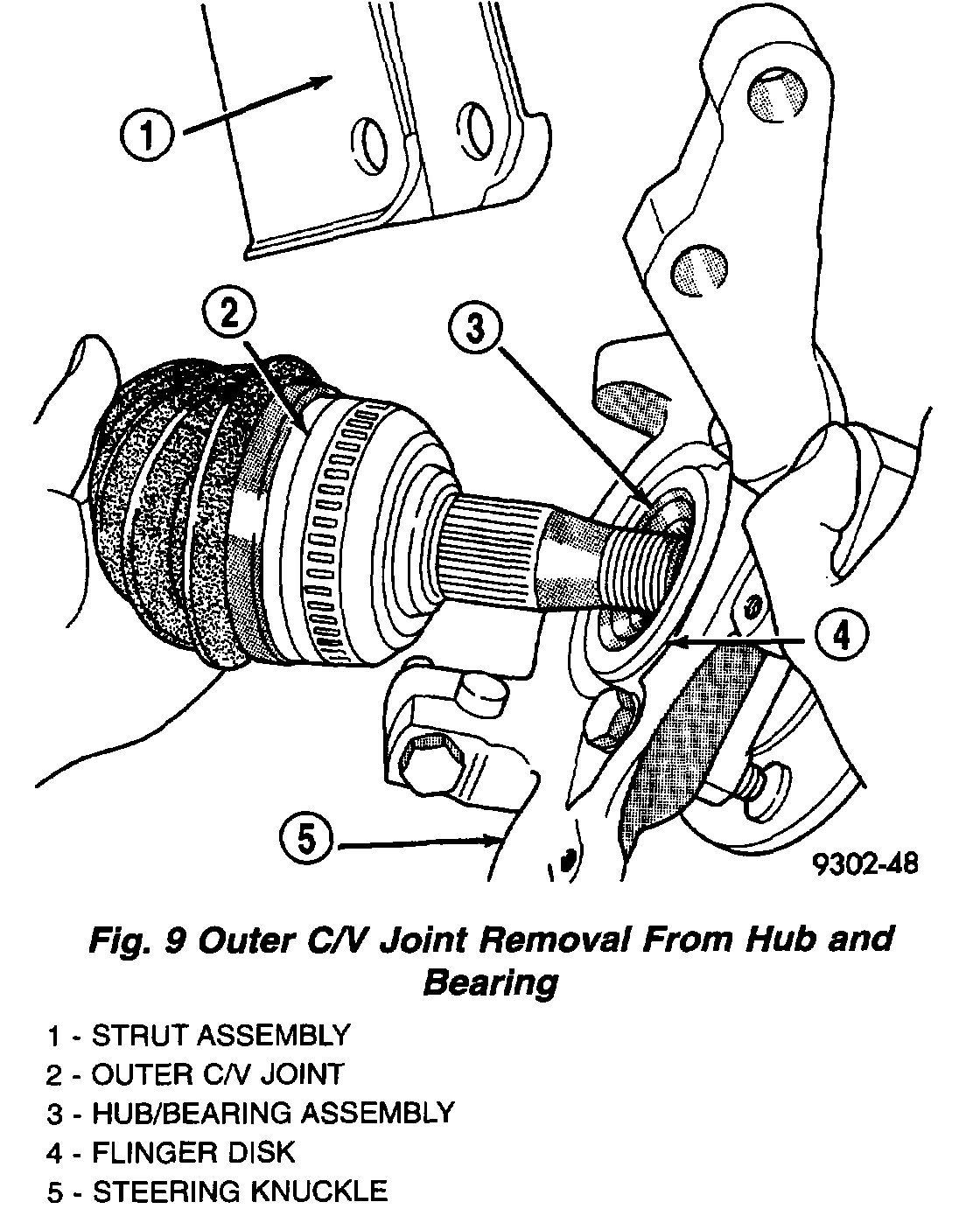 CAUTION: When removing outer C/V joint from hub and bearing assembly, do not allow the flinger disk (Fig. 9) on hub and bearing assembly to become damaged. Damage to the flinger disk will cause dirt and water intrusion into bearing. Premature bearing failure will result.