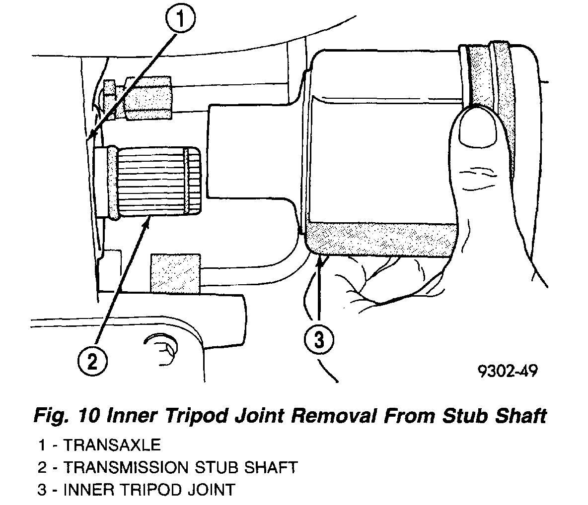 (11)Remove driveshaft inner tripod joint from transaxle stub shaft. When removing driveshaft, do not pull on interconnecting shaft to remove inner tripod joint from stub shaft. Removal in this manner will separate the spider assembly from the tripod joint housing. Grasp inner tripod joint (Fig. 10) and interconnecting shaft and pull on both pieces at the same time.