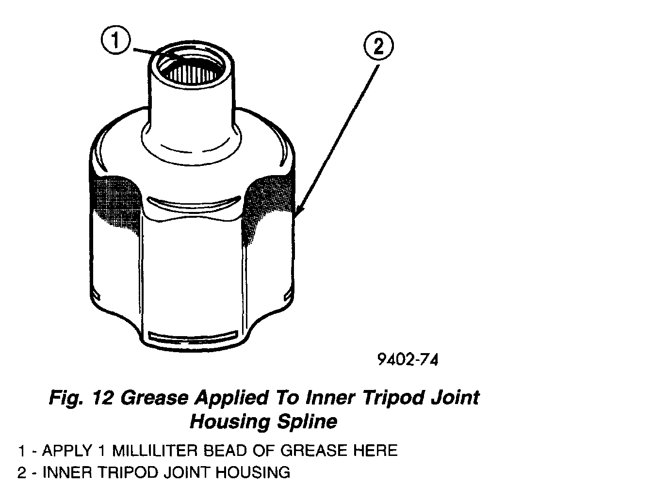 (2)Evenly apply a bead of grease, such as Mopar Multi-Purpose Lubricant or an equivalent, around spline of inner tripod joint (Fig. 12) where the O-ring seats against tripod joint. This will spread grease onto stub shaft during tripod joint installation preventing corrosion and help to seal the O-ring.