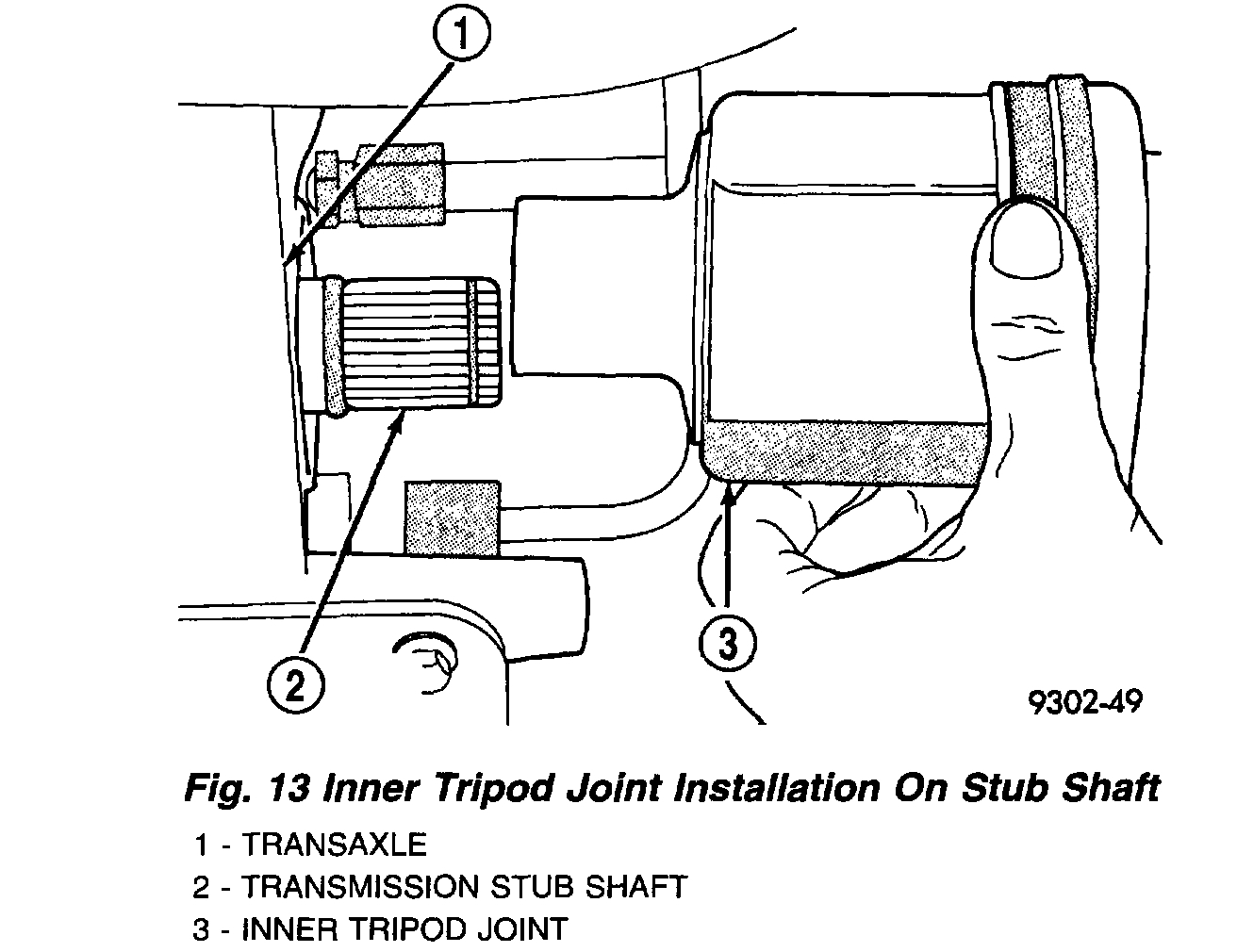 (3)Install driveshaft through hole in splash shield. Grasp inner tripod joint in one hand and interconnecting shaft in the other. Align inner tripod joint spline with stub shaft spline on transaxle (Fig. 13). Use a rocking motion with the inner tripod joint, to get it past the circlip on the transaxle stub shaft.