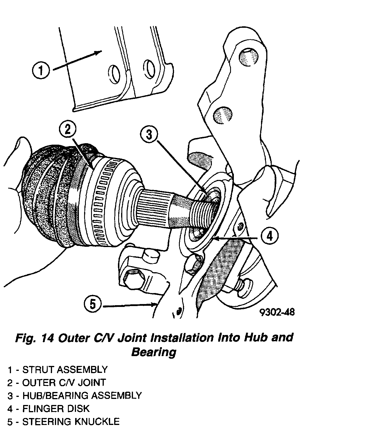 (5)Hold outer C/V joint assembly with one hand. Grasp steering knuckle with other hand and rotate it out and to the rear of the vehicle. Install outer C/V joint into the hub and bearing assembly (Fig. 14).