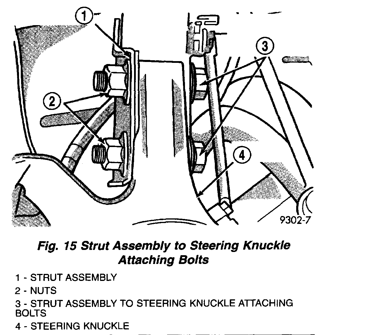 (7)Install the strut assembly to steering knuckle attaching bolts. Install nuts on attaching bolts (Fig. 15). Tighten the strut assembly to steering knuckle bolt nuts to 210 Nm (155 ft. lbs.). TURN NUTS ON BOLTS. DO NOT TURN BOLTS.