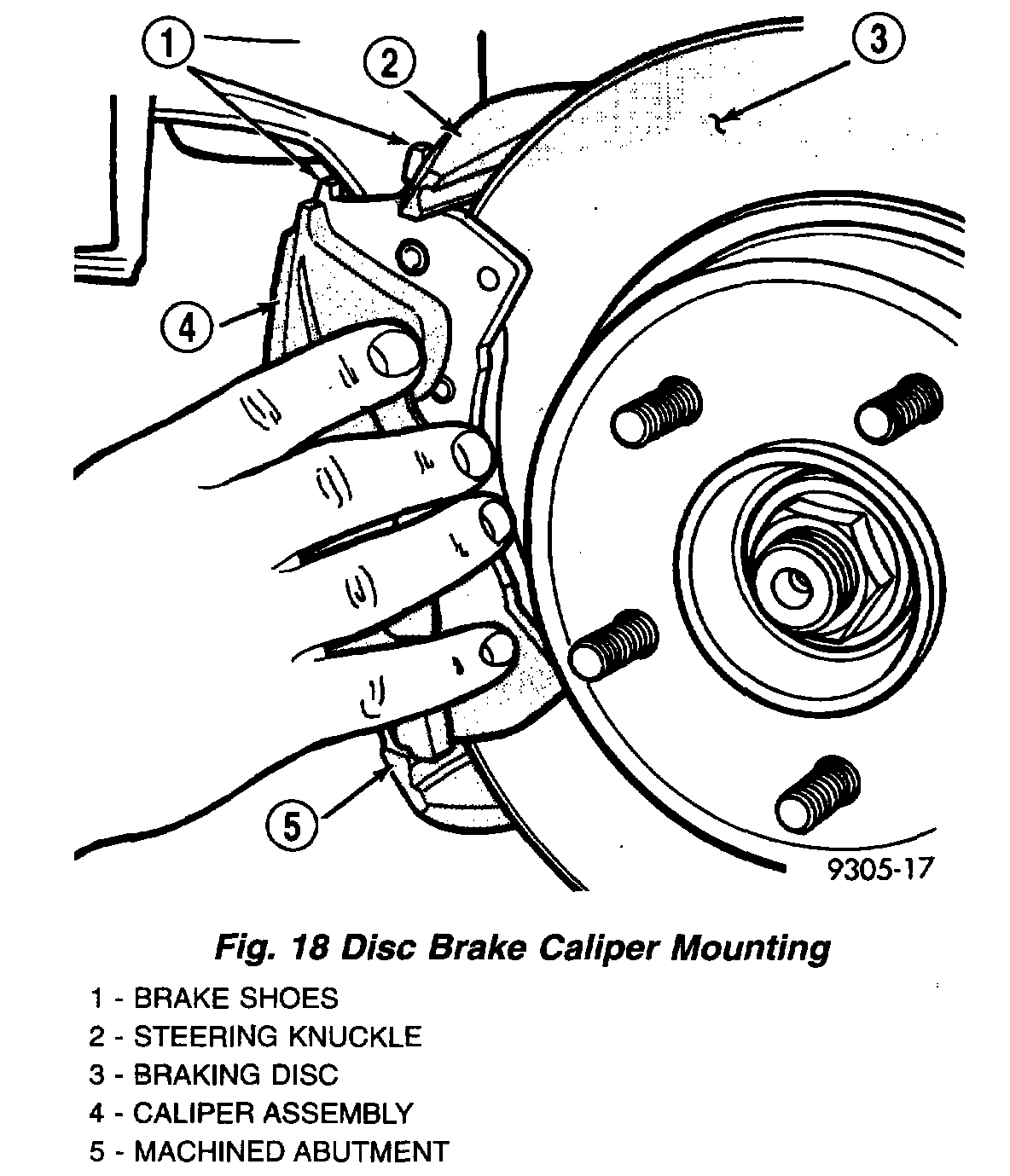 (11)Install front brake caliper over braking disc and align with caliper mounting holes on steering knuckle (Fig. 18). Install the caliper to steering knuckle bolts. Tighten bolts to 22 Nm (192 inch lbs.).