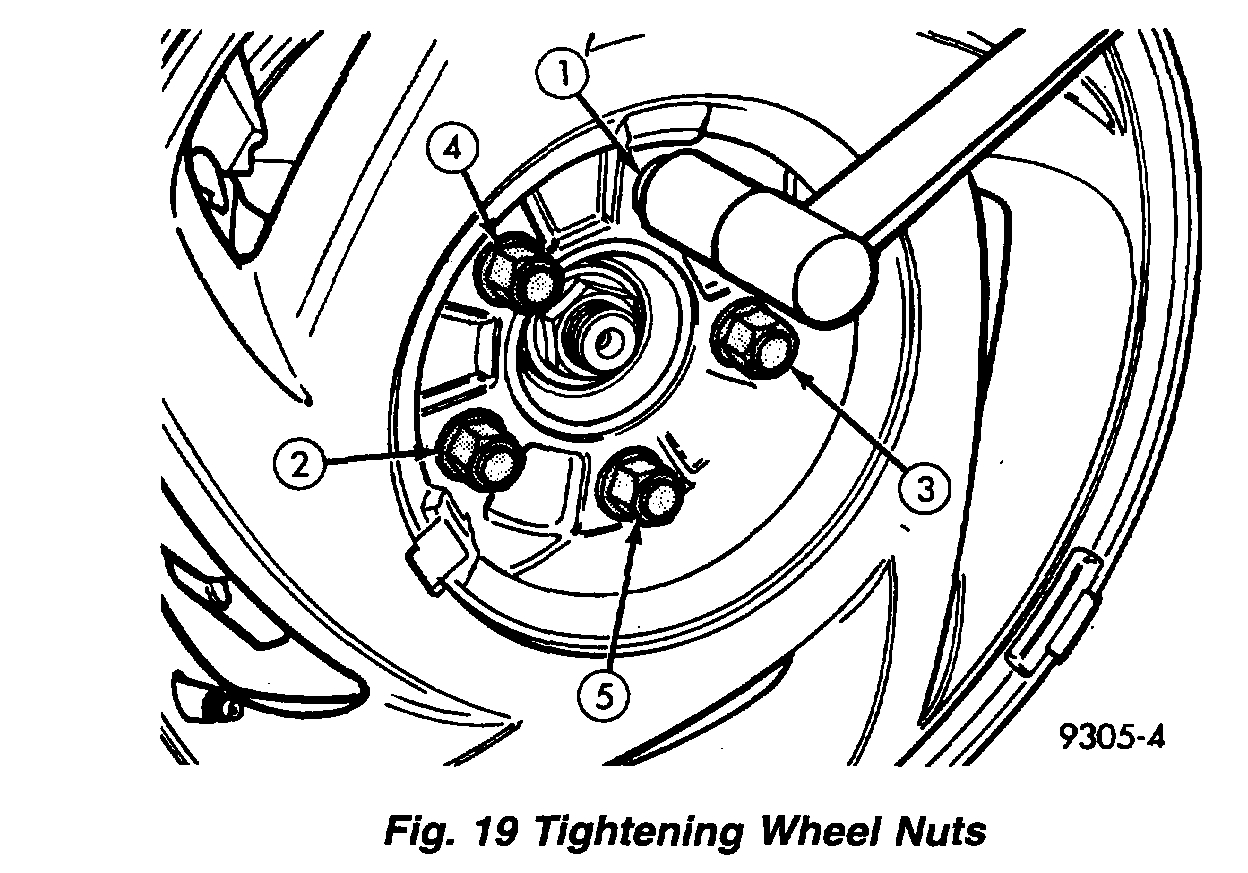 (12)Install wheel and tire assembly on vehicle. Tighten the wheel mounting stud nuts in proper sequence (Fig. 19), until all nuts are tightened to half specification. Then repeat the tightening sequence to the full specified torque of 135 Nm (100 ft. lbs.).