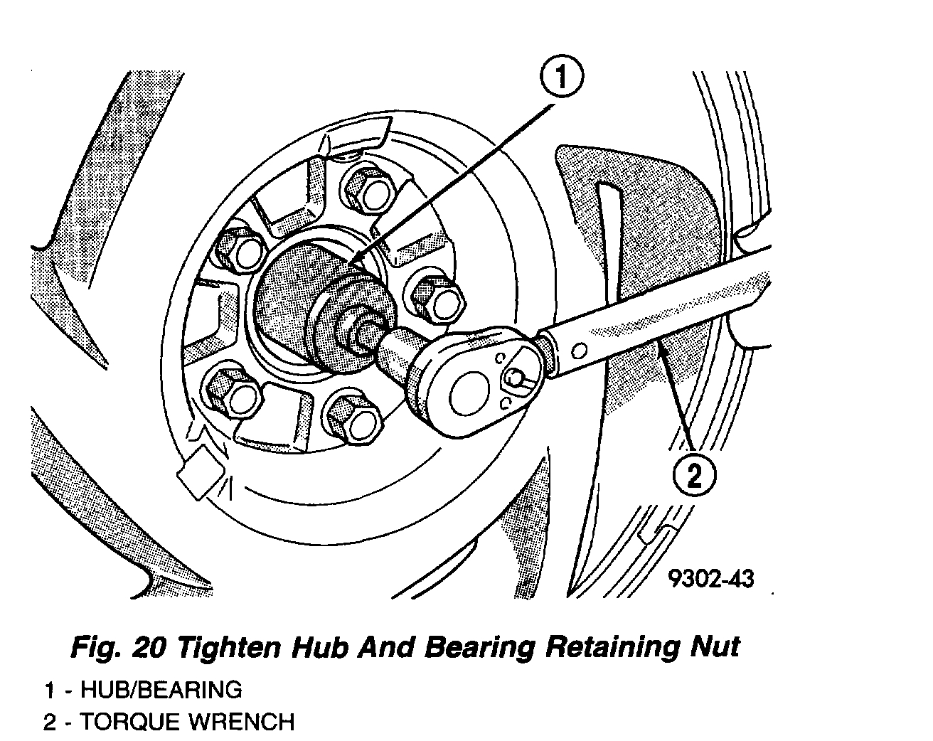 (14)Apply the vehicle's brakes to keep vehicle from moving. Tighten the NEW stub shaft to hub and bearing assembly retaining nut to 142 Nm (105 ft. lbs.) (Fig. 20).