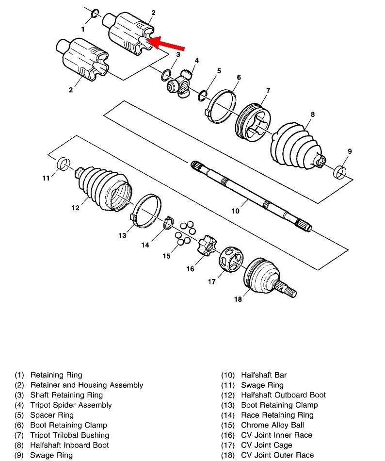 This drawing shows the exploded view of the half shaft. Items 1 through 9 are the inner joint. They don't show the spring I mentioned. My red arrow is pointing to where it is.