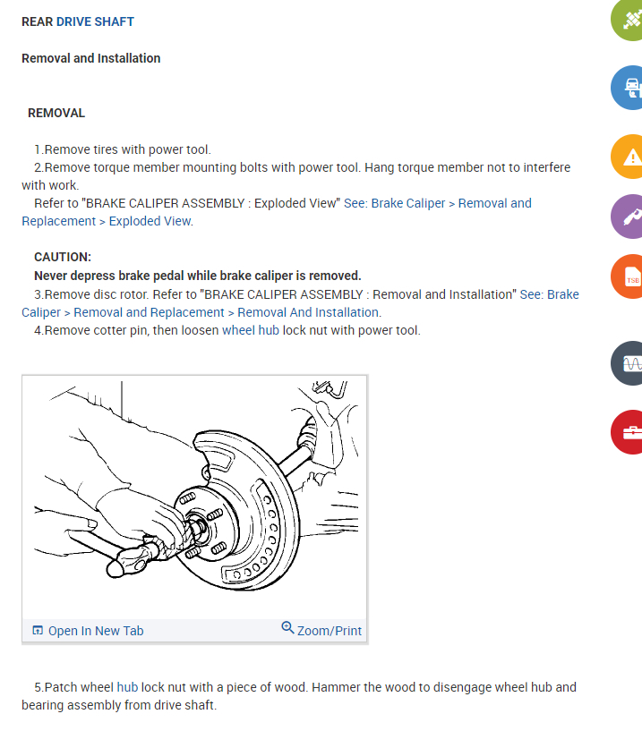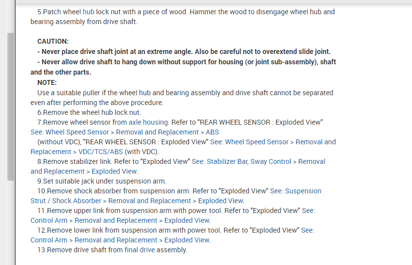 I am also attaching the info from the manual below on the rear axles. You need to remove the caliper, but it appears the cable can stay attached.