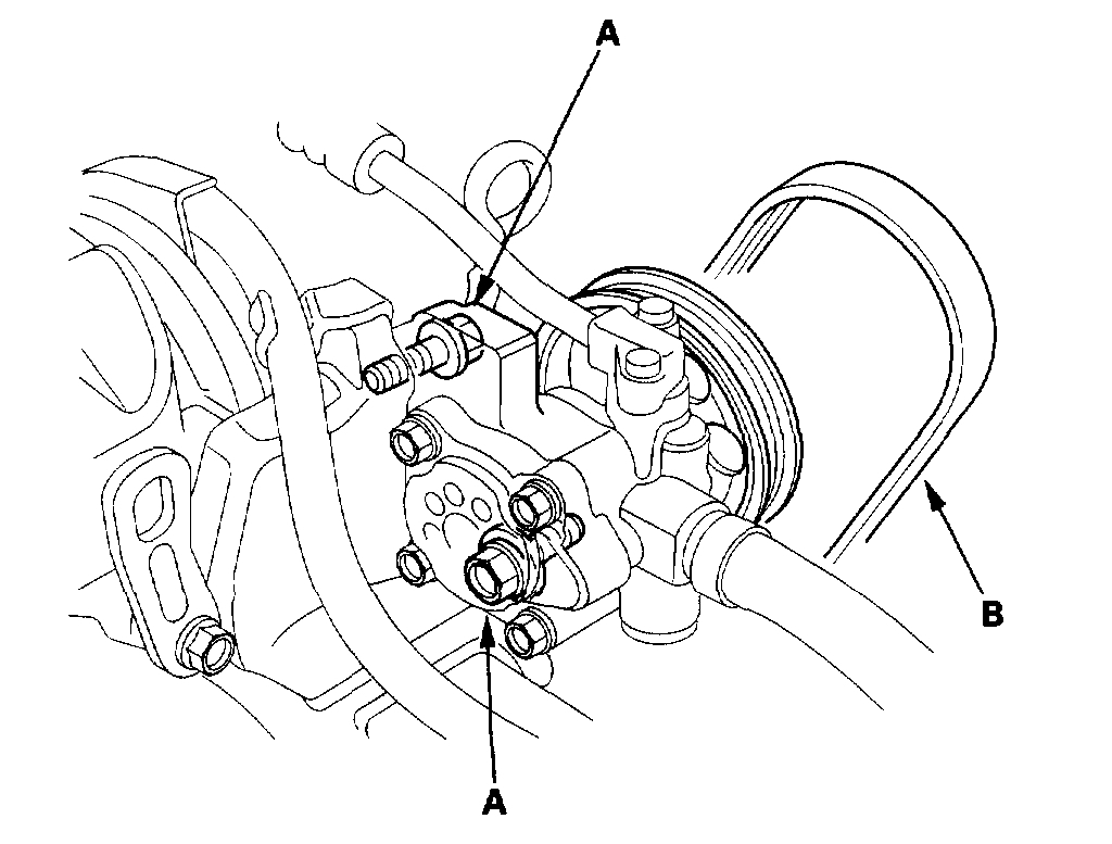 6. Loosen the mounting bolts (A), then remove the P/S belt (B).