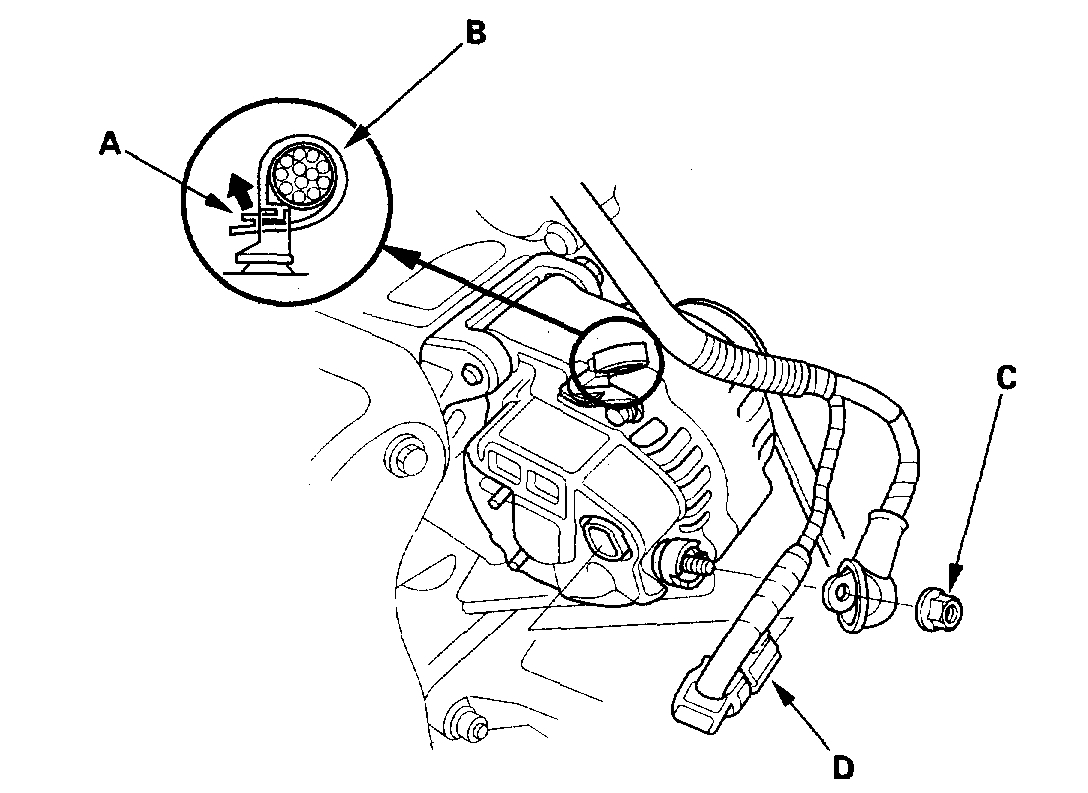 - 1 Pull up the lock (A), then release the wire harness tie (B).