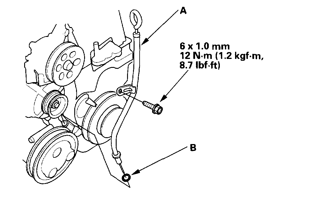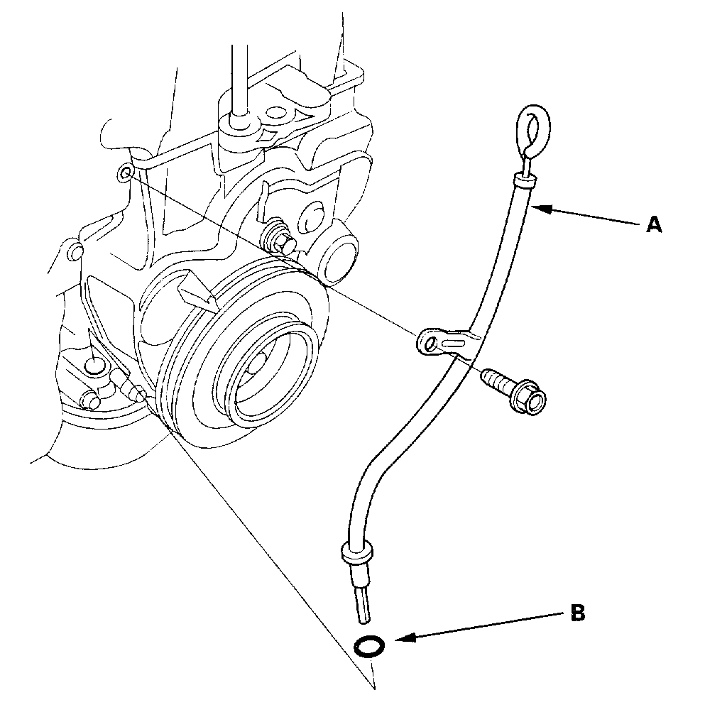 32. Install the dipstick and tube (A) with a new O-ring (B).