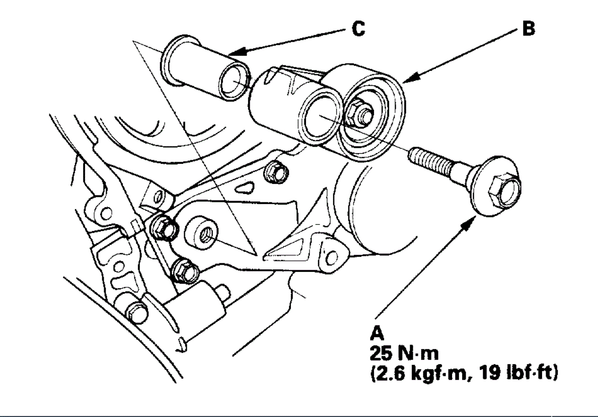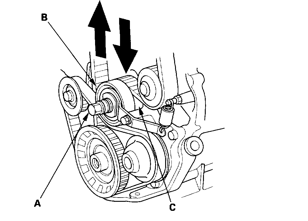 - 3 Push the timing belt tensioner (c) down to take tension off the timing belt.