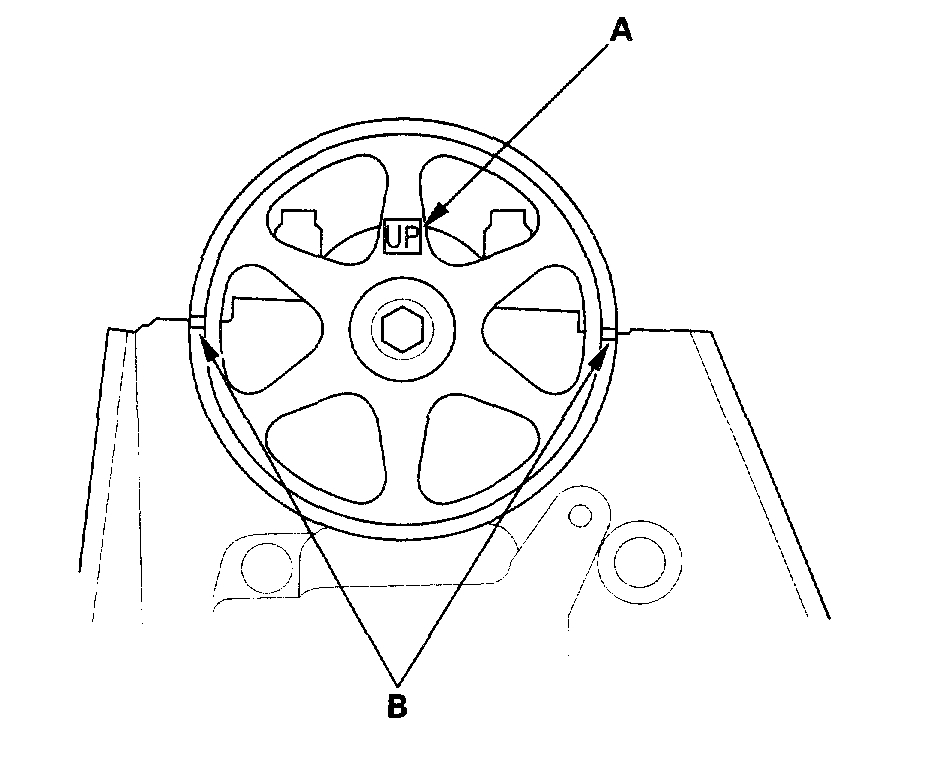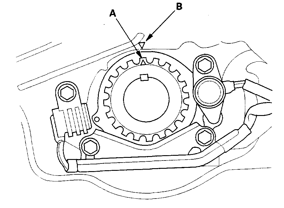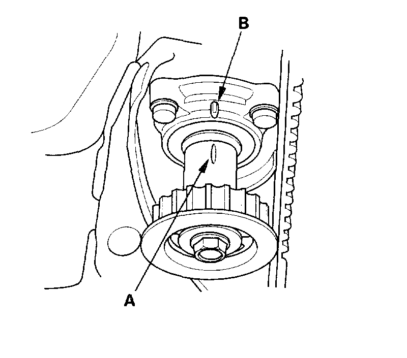 3. Set the crankshaft to TDC. Align the dimple (A) on the tooth of the timing belt drive pulley with the pointer (B) on the oil pump.