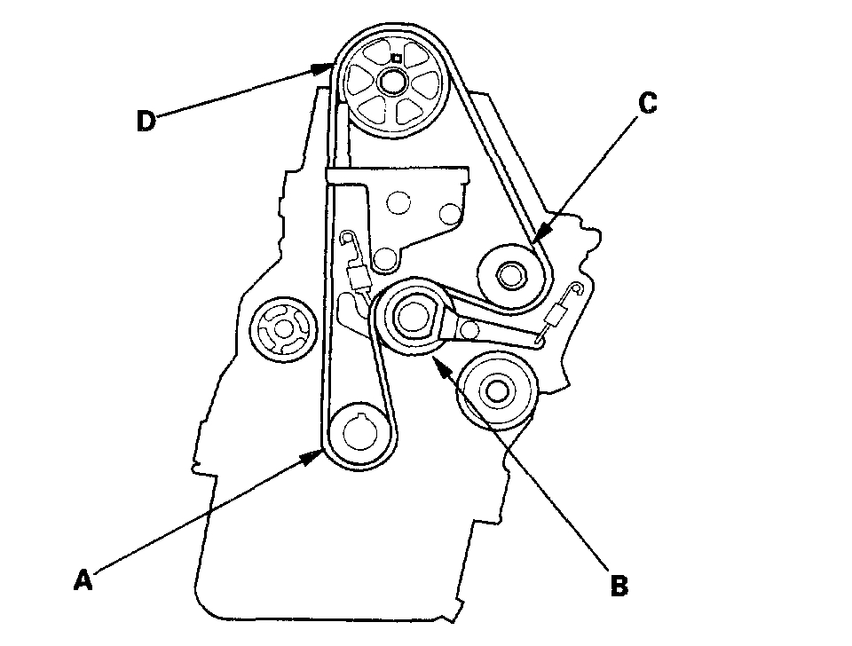 - 1 Install a 6 mm bolt (A)(from the timing cover) through the hole in the end of the timing belt adjuster arm to temporarily lock the arm in place.