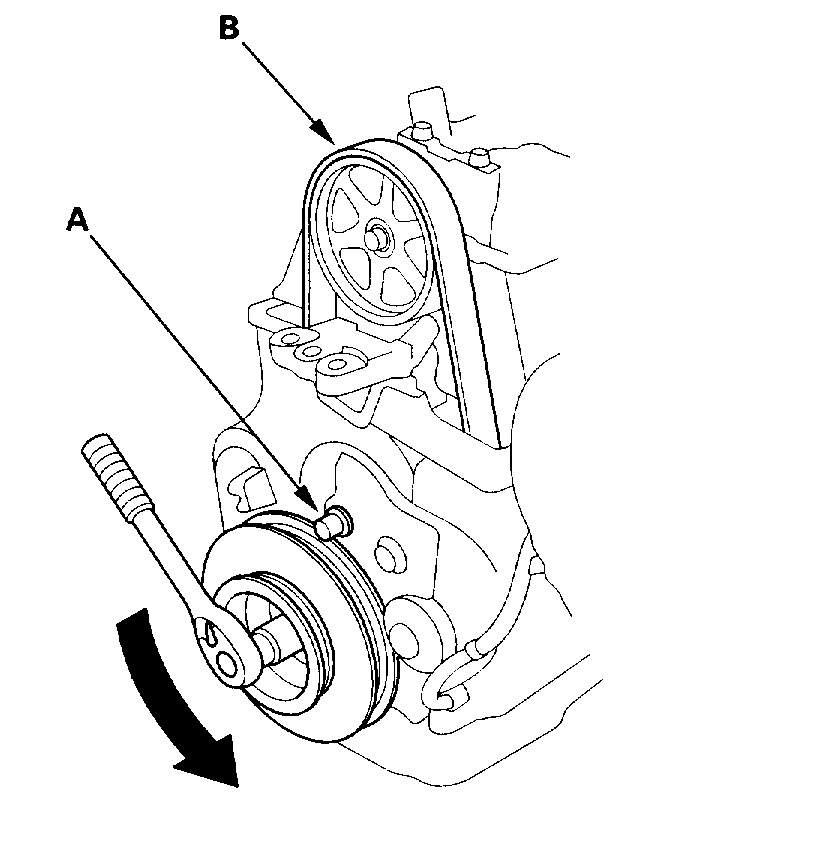 - 2 Align the TDC grooves (B) on the pulley with the too edge of the head.
