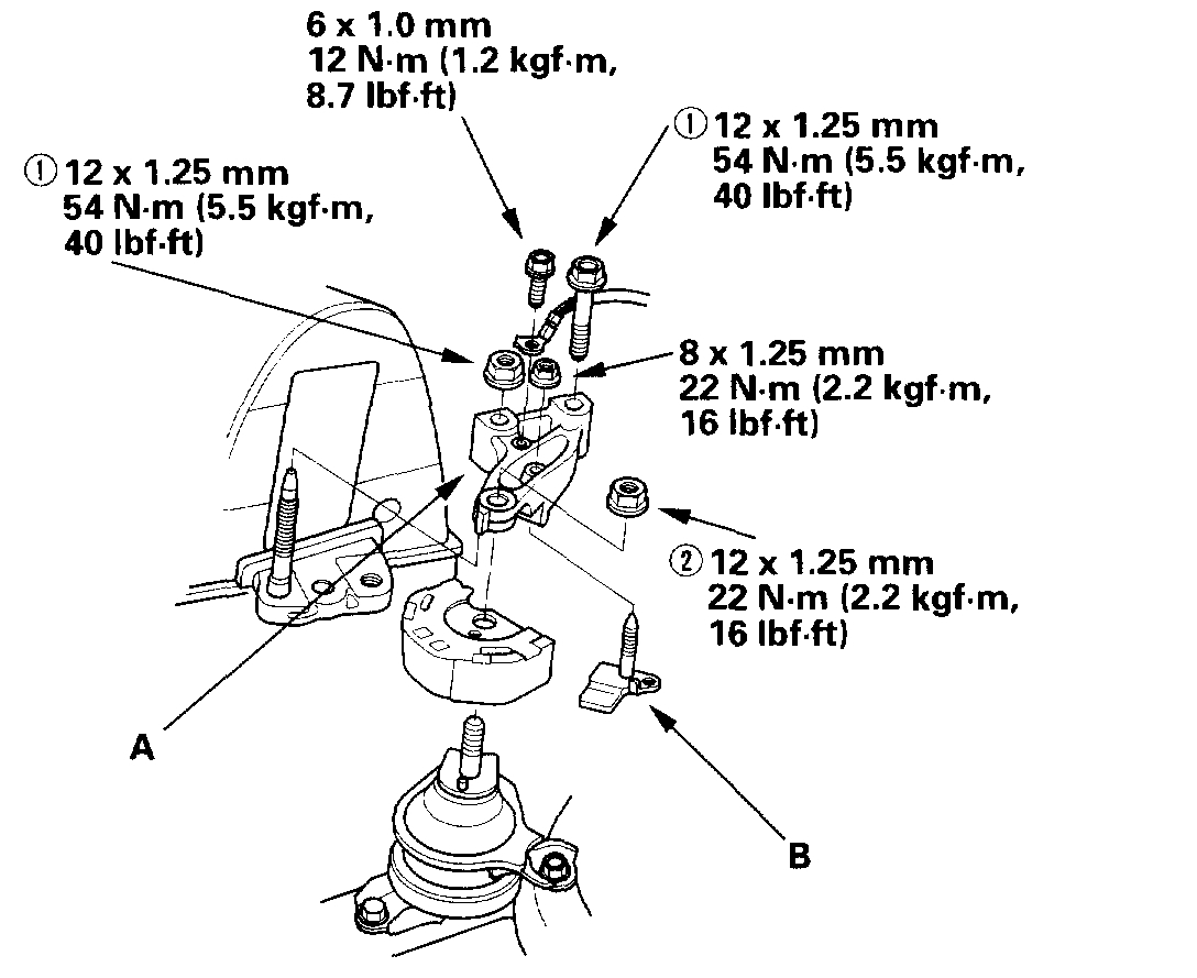 40. Install the upper bracket (A), then tighten the bolt and nuts in the numbered sequence shown.
