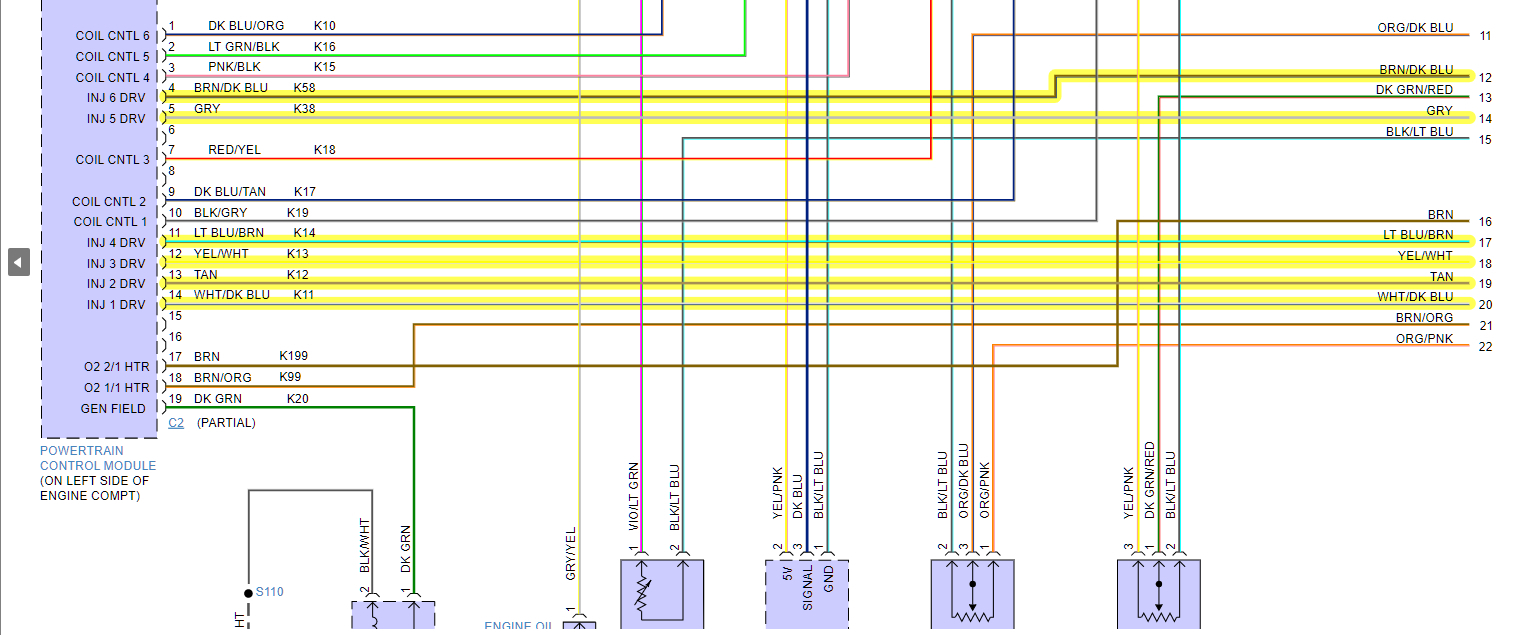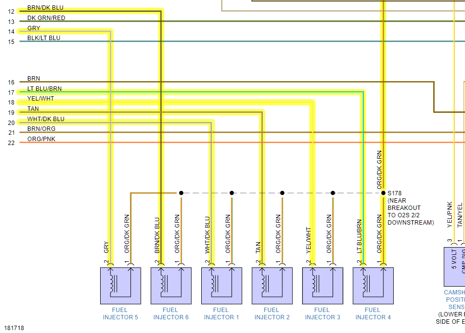 Hello, here's each injector (first page) and where they meet up at the ECM connector C2. If you need anything else, just let us know. The orange/dark green wire is the power feed. (12v)