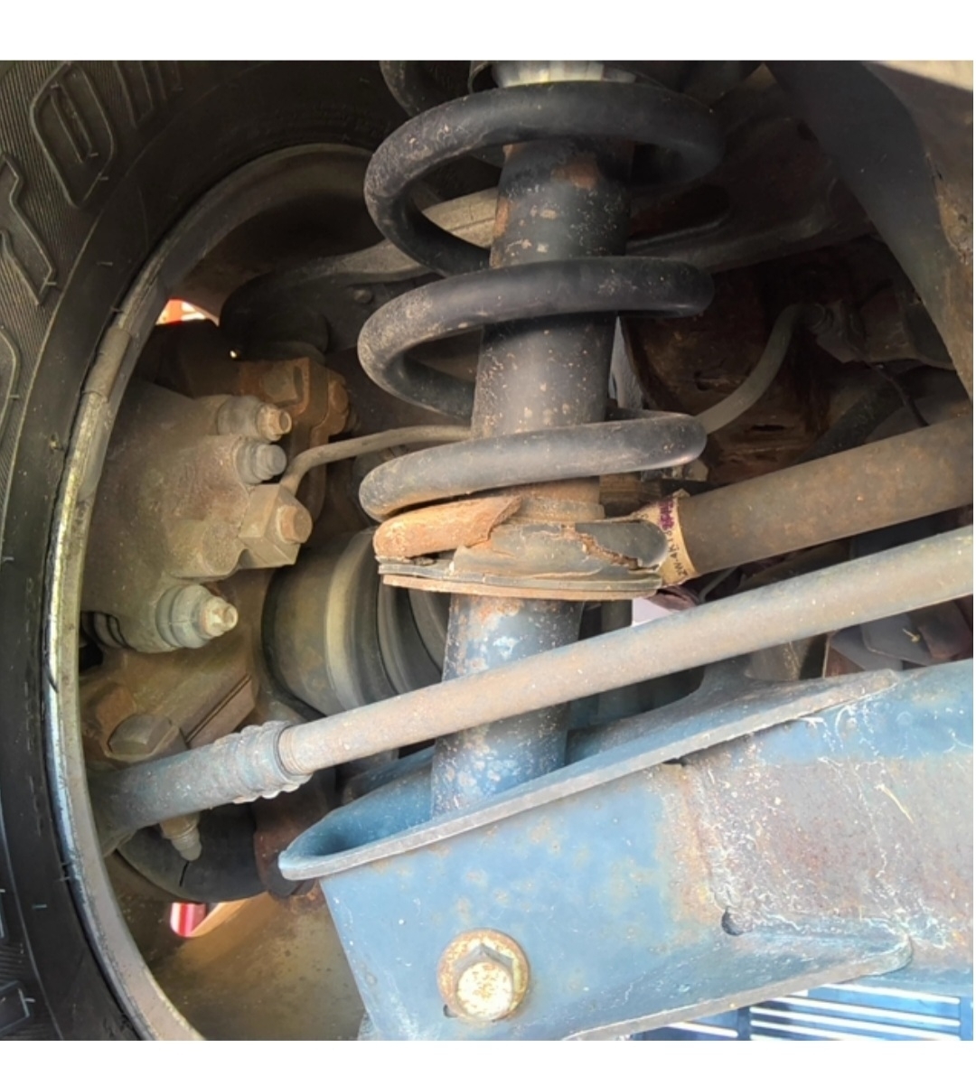 Please see picture attached. I will be replacing rear struts. Questions...can I drive locally with this damage for another week...also when I drive, I have noticed when I use brakes to turn corner or go around a curve the steering wheel seems to "freeze: for a second then gets loose. Could this cause that or would it be another issue such as brakes. The steering fluid is black but the guy at shop said that's normal for this type of vehicle when I requested a steering fluid flush. When I drive and let go of steering wheel the car doesn't pull to one side...it goes pretty straight. I originally took to shop due to steering issue. please advise if picture did not attach.