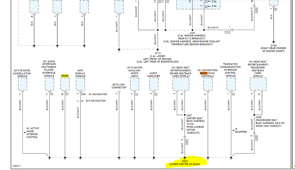 The last pic shows the location of the ones I would recommend checking first. If you noticed on the wiring schematic, there are two that I highlighted, G210 and G203. The last pic gives you a general location where they are located. If they appear okay, shake them to see if you can cause the lights/radio to act up.