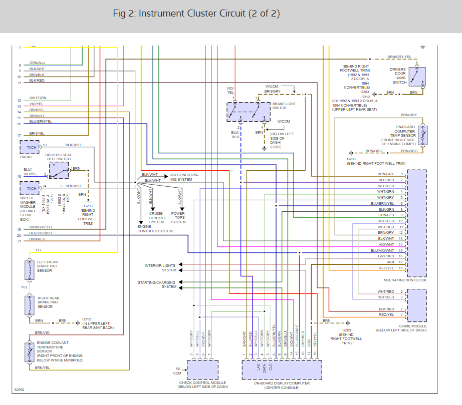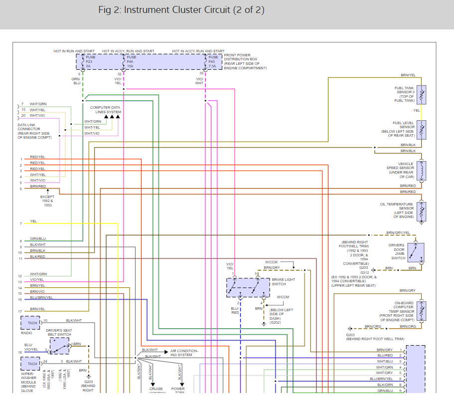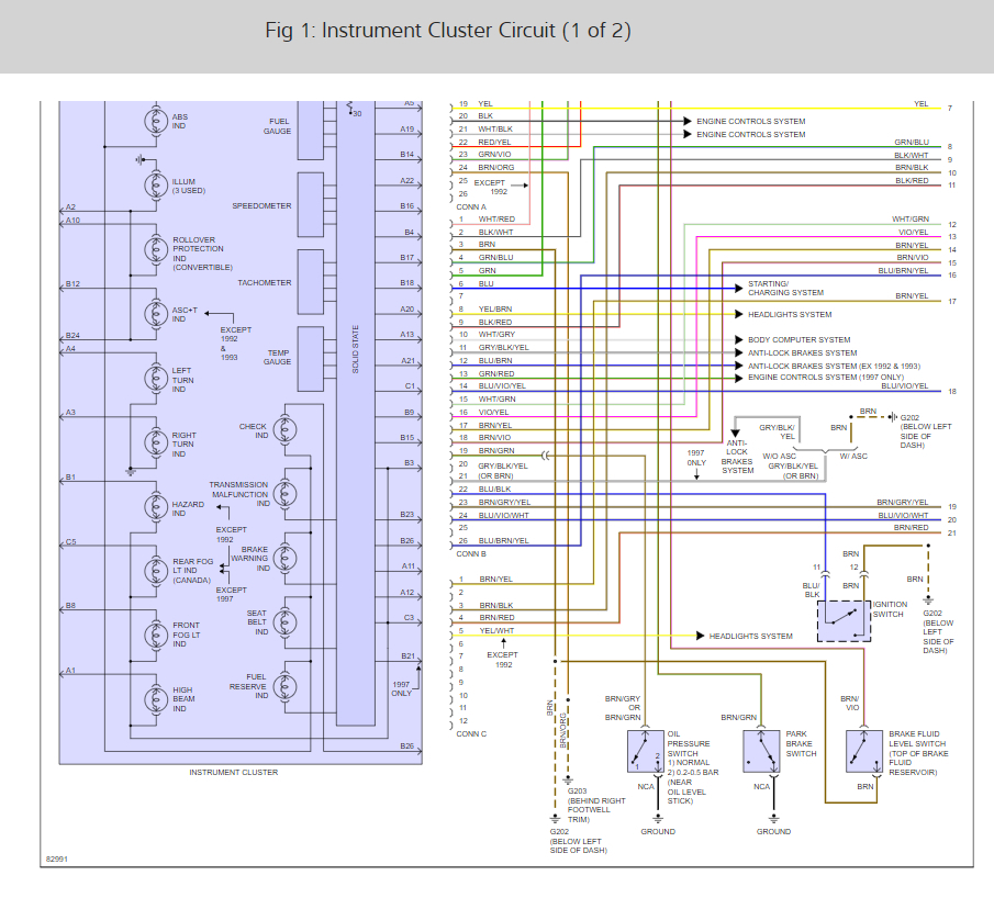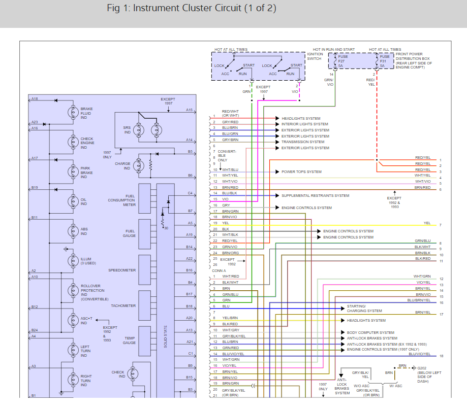there are 5 fuses that run the cluster lets start by checking for power at each of them with the key on. here is a guide to help and the cluster wiring diagrams so you can see how it works and the fuses needed: