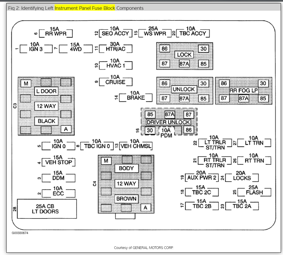 I have power and orange wire going to the doors but the windows locks in mirrors and cluster gauges do not work. I got separated from my wife last winter and I really don't know what happened with the truck since I've been gone. I don't know if somebody harvested some parts or what. but I found a connector driver side behind the light switch above the transfer case shift module that has been plugged into something but there's nothing in it now and no place to plug it in. I think a splicer pack belongs in it or a busbar whatever you like to call it. jumping bar but I'm really not sure it's a 12 pin connector female and it has 10 pins in it. I will send you a picture the top of the connection is labeled f which is like a light brown e which is white d which is purple c which is blue. I'm not sure what the last two letters are what the next color is dark green then in the end one I believe it's purple orange and pink. there's two wires going in it and then on the bottom. I think the letters are j which is gray then h which is blue with a white stripe. the next two terminals are empty and then there's l which is brown and then m which is lime green. I appreciate you reading this hope you can make some sense of it. thank you