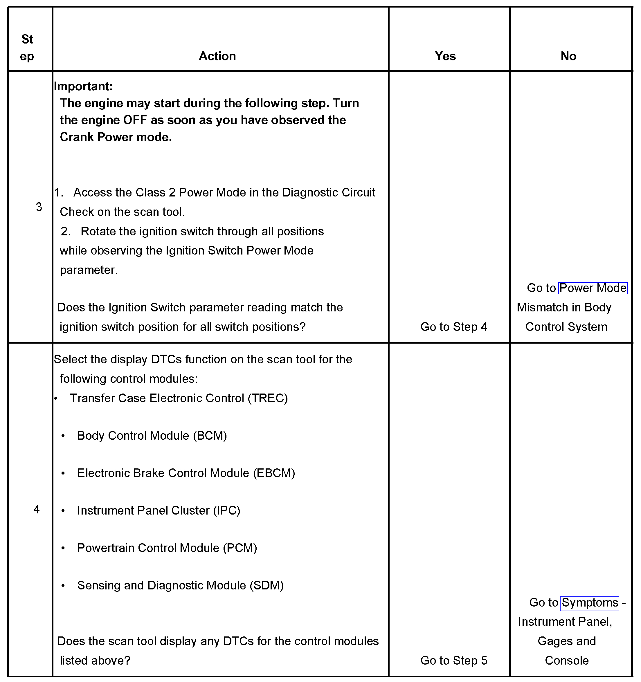 The numbers below refer to the step numbers on the diagnostic table.